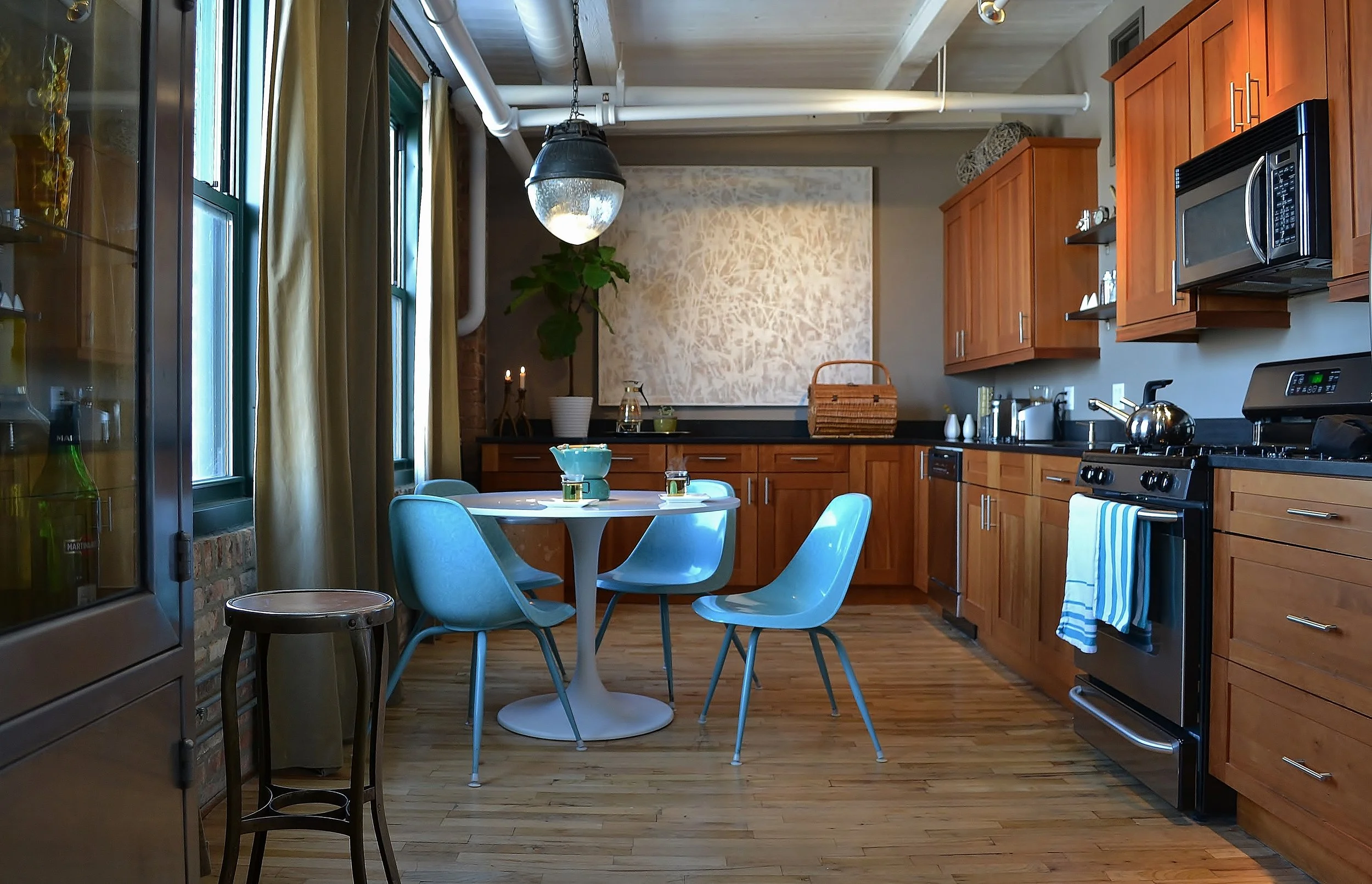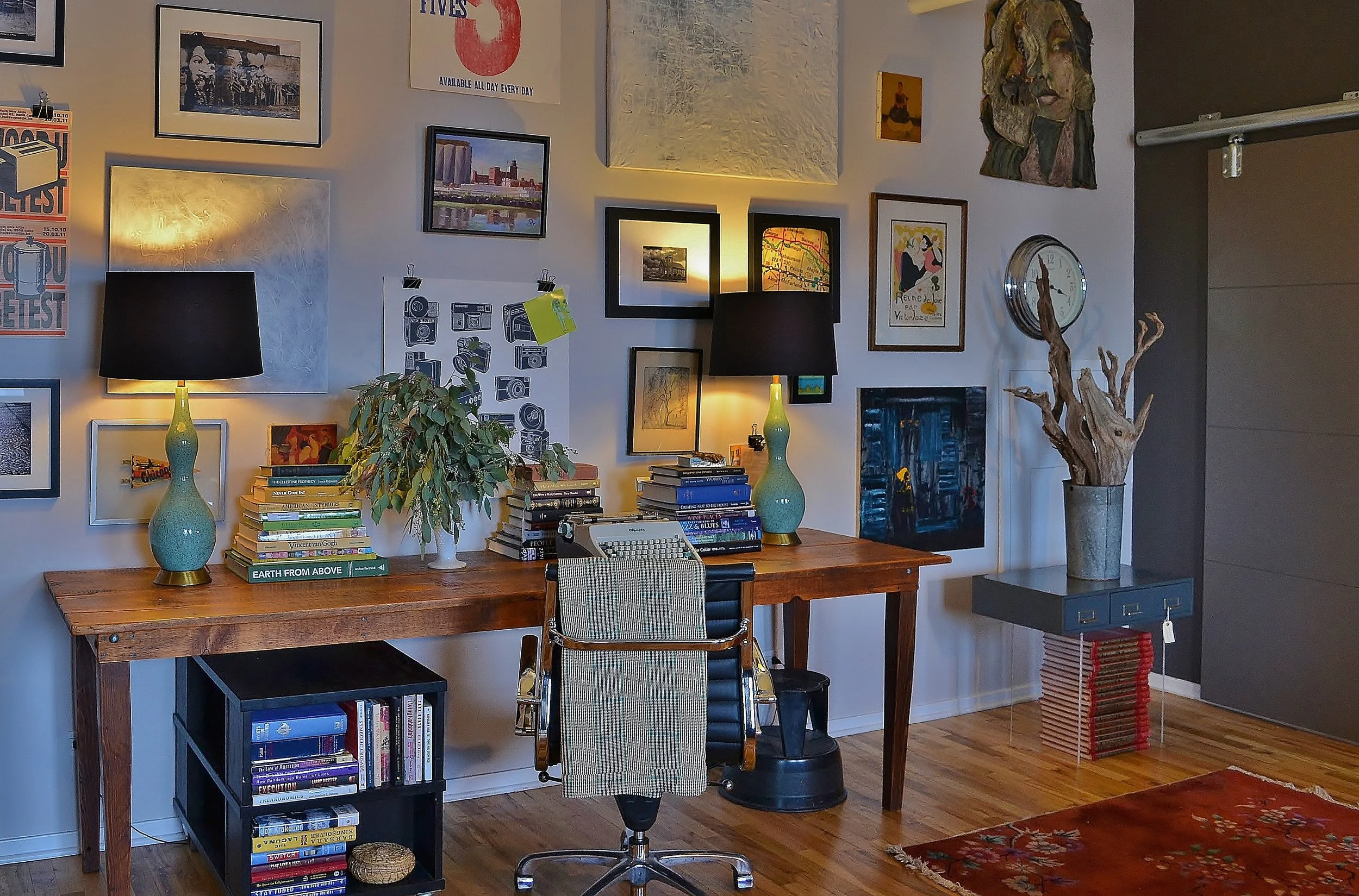An authentic timber loft in Chicago's West Town neighborhood with skyline views from every window, funky collections and a vintage modern mix. A unique building of lofts converted from an old furniture factory.